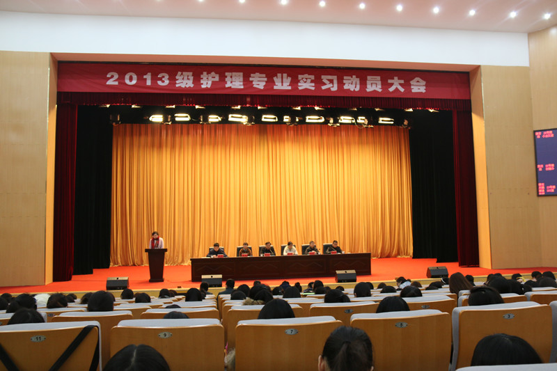2016年2月25日,我校在学术报告厅召开2013级护理专业学生实习动员大会,张生玉副校长、宿迁市第一人民医院护理部副主任蔡小丹、宿迁市中医院护理部实习总带教李红、教务处处长丁炳干、学工处处长赵双久和招就处处长王立出席会议并讲话,各实习组管理老师、有关班主任和学生参加会议,会议由王立处长主持。