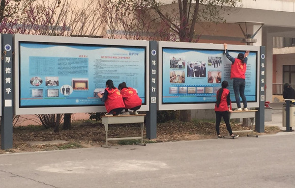 三月温暖的春风送来了又一个雷锋月,为了引导广大青年学生继承优良传统,弘扬志愿服务精神,在校团委的指导下,我校仁爱志愿者协会在校园内开展了为期一个月的雷锋主题系列活动,如:清理食堂、打扫礼堂、后山清扫、“志愿伴我行”主题讲座、敬老院送温暖、环保公益徒步走、校园橱窗“洗脸”活动等。在活动中同学们大力弘扬雷锋不怕苦、不怕累的精神,团结一致,积极向上,服务同学,服务校园,为构建“和谐社会,和谐校园”发挥了积极作用。