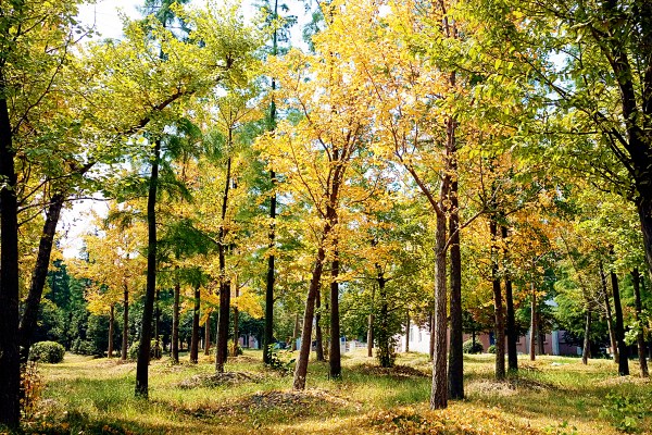 松修长挺拔,犹如身着青袍的男子静静伫立于草地上,翘首盼望心爱的姑娘从远方归来。与之相比,银杏便更显温婉。秋雨将银杏的叶逐渐渡染成黄色,风吹过,银杏叶轻轻摇动,好似少女们嬉笑着讨论她们的新衣。