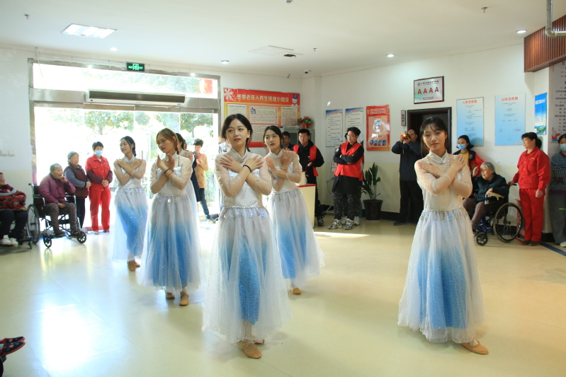 演出活动在开场舞《天天向上》中拉开序幕,在近一个小时的倾情演出中,相继演绎了歌曲《粉红色的回忆》、舞蹈《繁华》、诗朗诵《感恩》等九个节目,最后在与老年人互动的广场舞《最炫民族风》中落下帷幕并将演出推向高潮。参演的同学们嘹亮的歌声、精美的舞蹈将浓浓的敬老情注入到每个老人的心田,为平日宁静略显单调的护理院增添了许多欢快喜庆色彩,也不时博得在场所有老人和敬老院职工的阵阵热烈掌声。